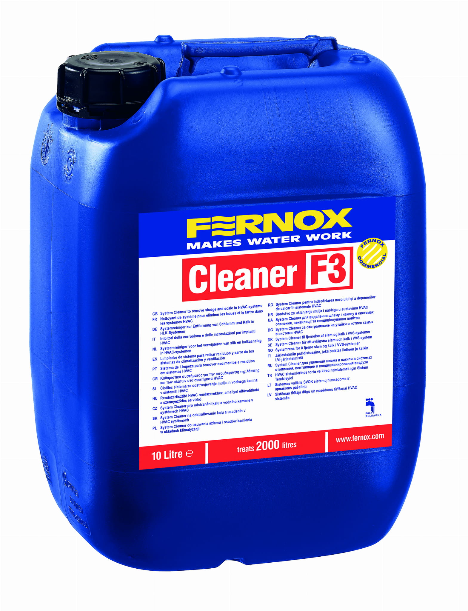 Uniwersalny środek czyszczący przeznaczony do stosowania w systemach HVAC oraz niezbyt obciążonych komercyjnych instalacjach ogrzewania i chłodzenia. Cleaner F3 może być używany do czyszczenia przed uruchomieniem nowych instalacji, usuwania pozostałości topnika, oleju/smaru i innych zanieczyszczeń pomontażowych. Cleaner F3 może być również używany do usuwania szlamu, osadów kamienia i innych zanieczyszczeń krążących w istniejących lub zanieczyszczonych instalacjach, poprawiając w ten sposób ich efektywność i zapobiegając uszkodzeniom elementów instalacji. Ten bardzo skuteczny, szybko działający środek czyszczący jest kompatybilny ze wszystkimi metalami i materiałami powszechnie używanymi w instalacjach ogrzewania i chłodzenia, w tym stalą i aluminium. Jedna dziesięciolitrowa dawka produktu pozwala uzyskać zalecane do uzdatnienia wody stężenie 0,5% w instalacji o pojemności do 2000 litrów.