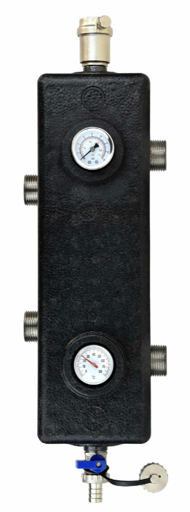 - 4 króćce 1“ do rur DN25 obiegów grzewczych, - 1 króciec ½“ do czujnika temperatury, - 1 króciec ½“ na górze do odpowietrznika, - 1 króciec ½“ na dole do zaworu spustowo/napełniającego. Zawiera: - izolację z EPP, - 1 korek ½“, - 1 automatyczny odpowietrznik pionowy, - 1 zawór spustowy/napełniający ½“