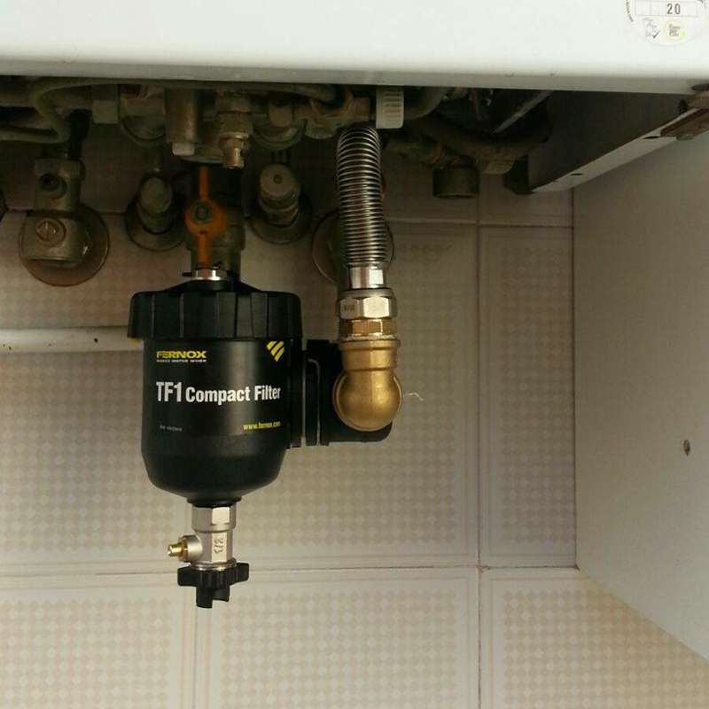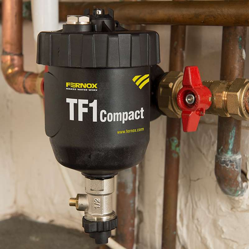 TF1 Compact Filter to bardzo skuteczny, magnetyczny filtr szeregowy, idealny do zabudowy w małych i ciasnych przestrzeniach. Ten prosty w montażu filtr z kompozytowego tworzywa sztucznego może być zabudowany w różnych położeniach na przewodach pionowych i poziomych. Jego konstrukcja umożliwia wychwytywanie zanieczyszczeń zarówno magnetycznych, jak i niemagnetycznych dzięki działaniu na zasadzie hydrocyklonu w połączeniu ze specjalnie zaprojektowanymi zespołami magnesów, co pozwala zbierać i utrzymywać zanieczyszczenia wewnątrz filtra do czasu ich bezpiecznego usunięcia. Szybkie czyszczenie za pomocą zaworu spustowego w mniej niż 2 minuty i bez zabrudzeń – nie ma potrzeby demontażu urządzenia. W komplecie znajduje się ulepszony inhibitor Protector + Filter Fluid, który zawiera środek dyspergujący pozwalający zmaksymalizować skuteczność filtra podczas zbierania zanieczyszczeń. Współdziałanie środka chemicznego i filtra zapewnia najwyższy stopień ochrony kotła i instalacji.